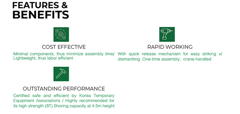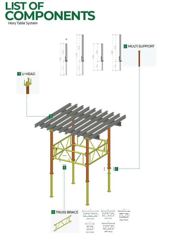 The Hory Table System is highly recommended for falsework applications in building projects with typical structures. Its versatile multi-props are ideal for backpropping or reshoring, offering certified safety and efficiency from the Korea Temporary Equipment Association.